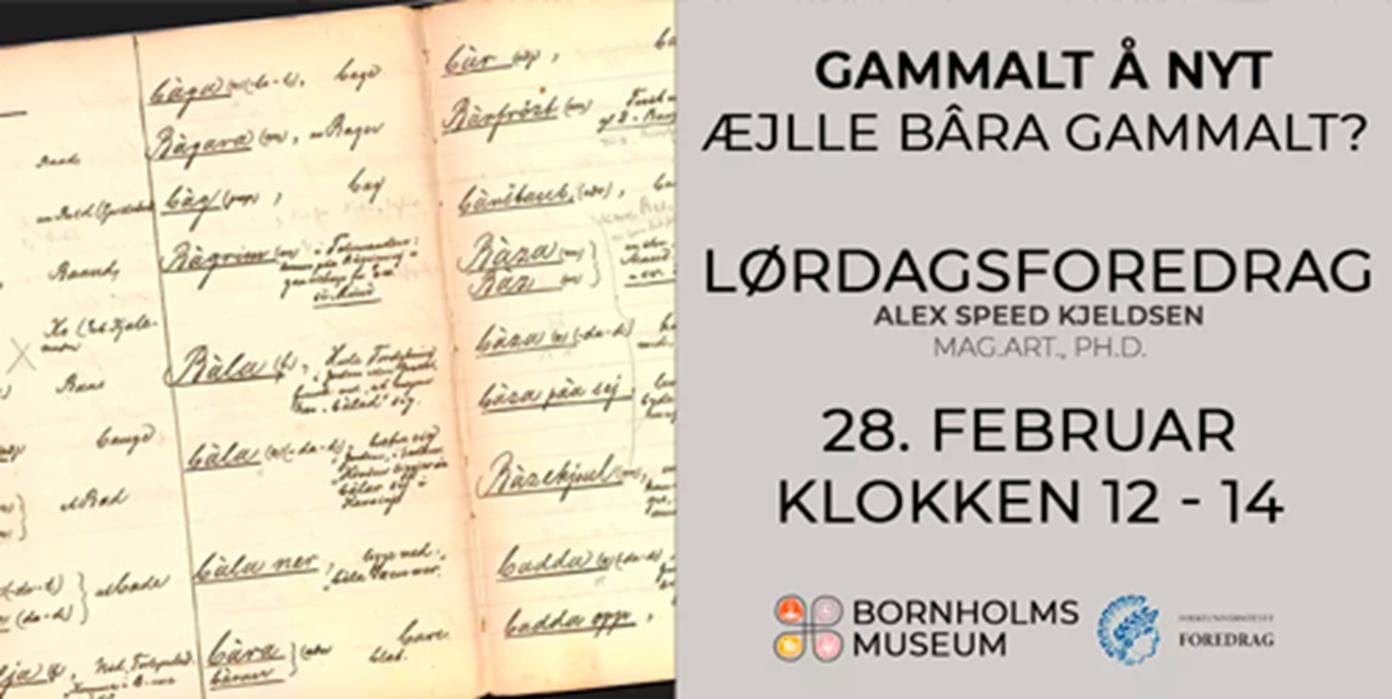 Under overskriften “Gammalt å nyt æjlle bâra gammalt?” vil Alex Speed Kjeldsen tale om de modsatrettede strømninger, der kan registreres i relation til arbejdet med og for det bornholmske i 1920’erne, 30’erne og 40’erne, en periode, der med rette kan betegnes som guldalderen for bornholmsk dialektlitteratur.