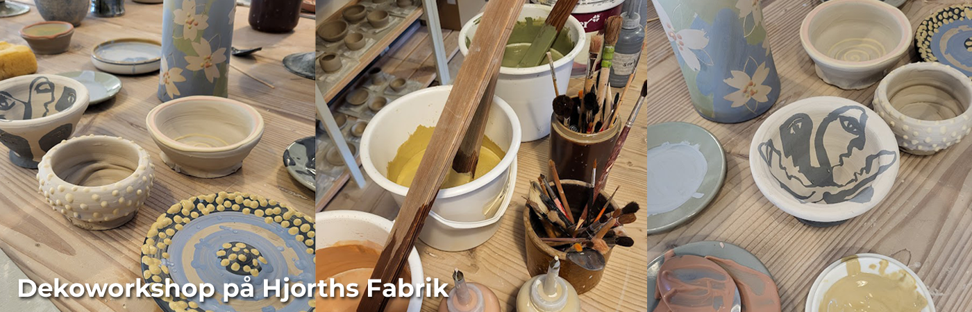 Workshoppen foregår i vores aktivitetsrum på Hjorths Fabrik. Her vil du, under kyndig vejledning, komme til at udfordre dig selv og dine kreative evner med pensel og glasur.